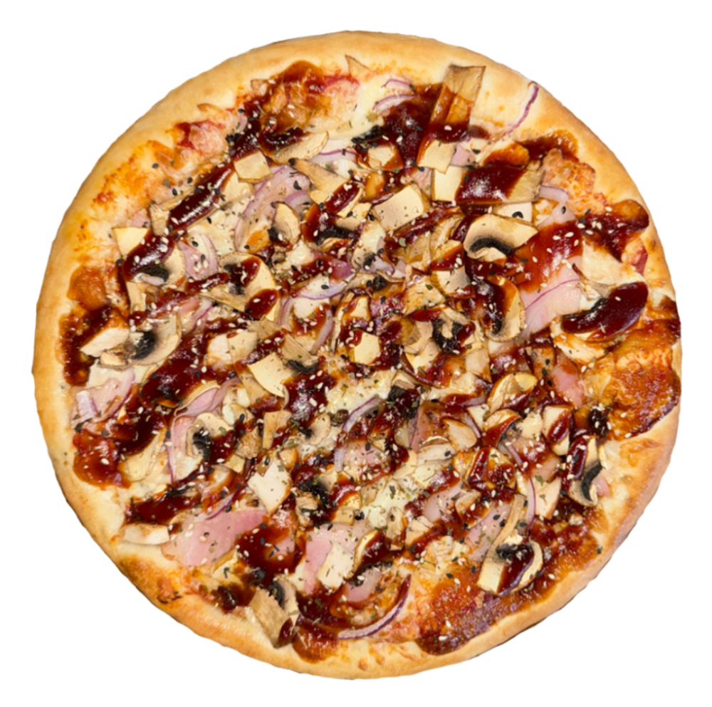 Бекон, куриное филе, шампиньоны, моцарелла, соус барбекю, кунжут