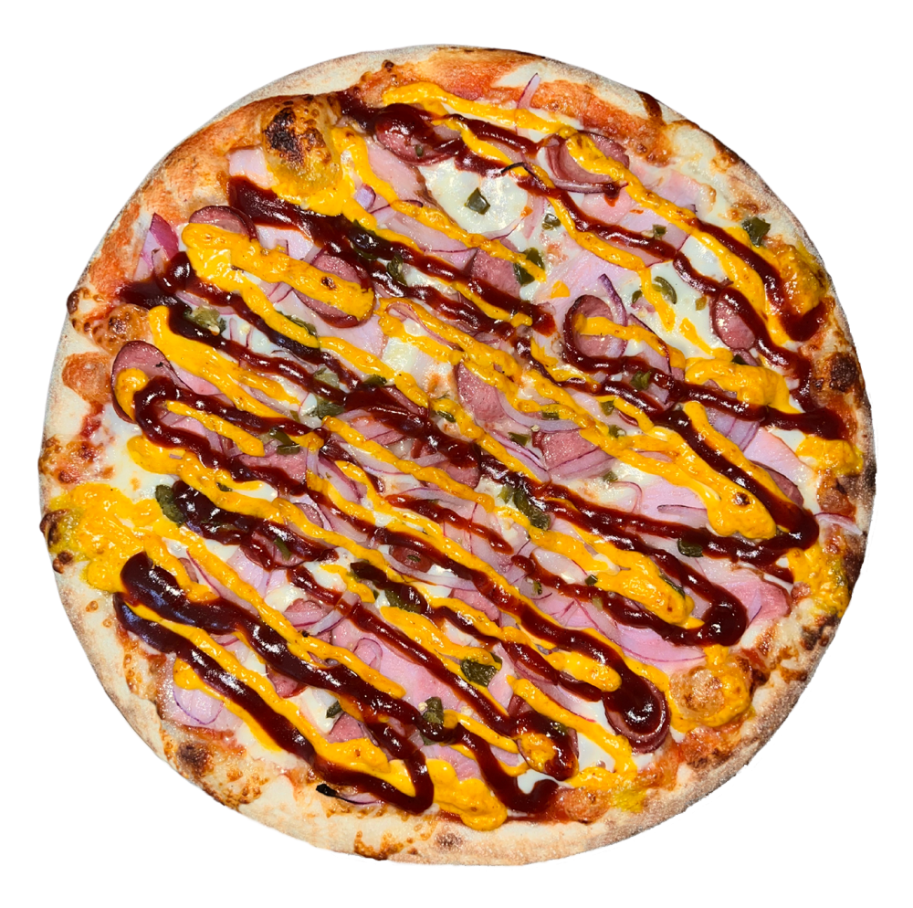 Бекон, колбаски охотничьи, моцарелла, лук красный, соус барбекю, халапеньо, соус горчичный