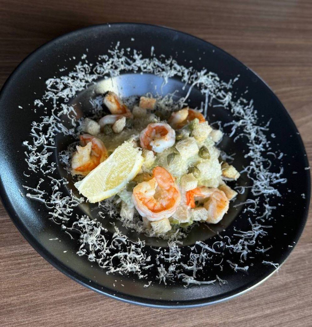 Креветки, томаты, пармезан, каперсы, лимон, салатным микс, сухарики, соус "Цезарь"