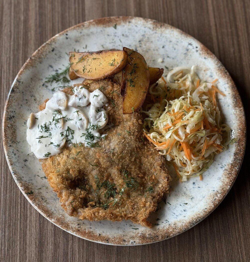 Вырезка из свинины, обжаренный картофель, салат из капусты, грибной соус