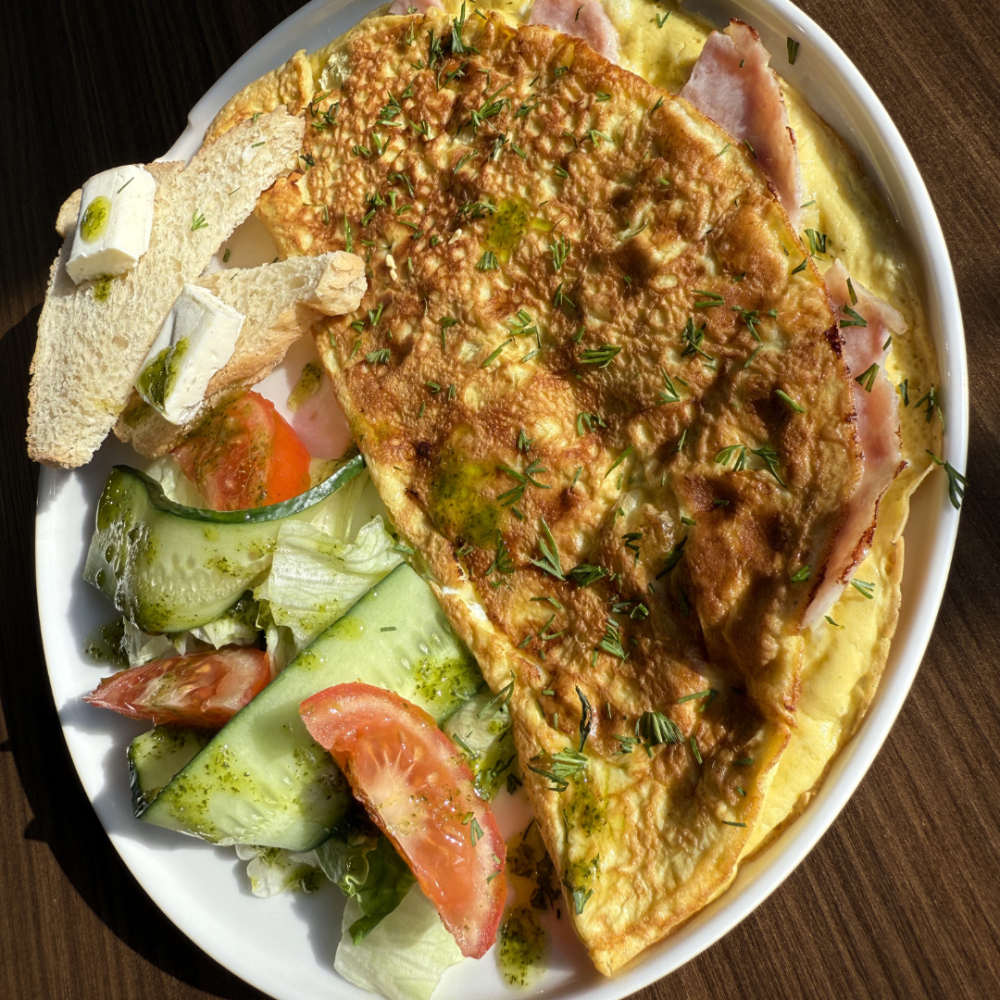 с ветчиной и сыром, тостами из белого хлеба, салатом из свежих овощей