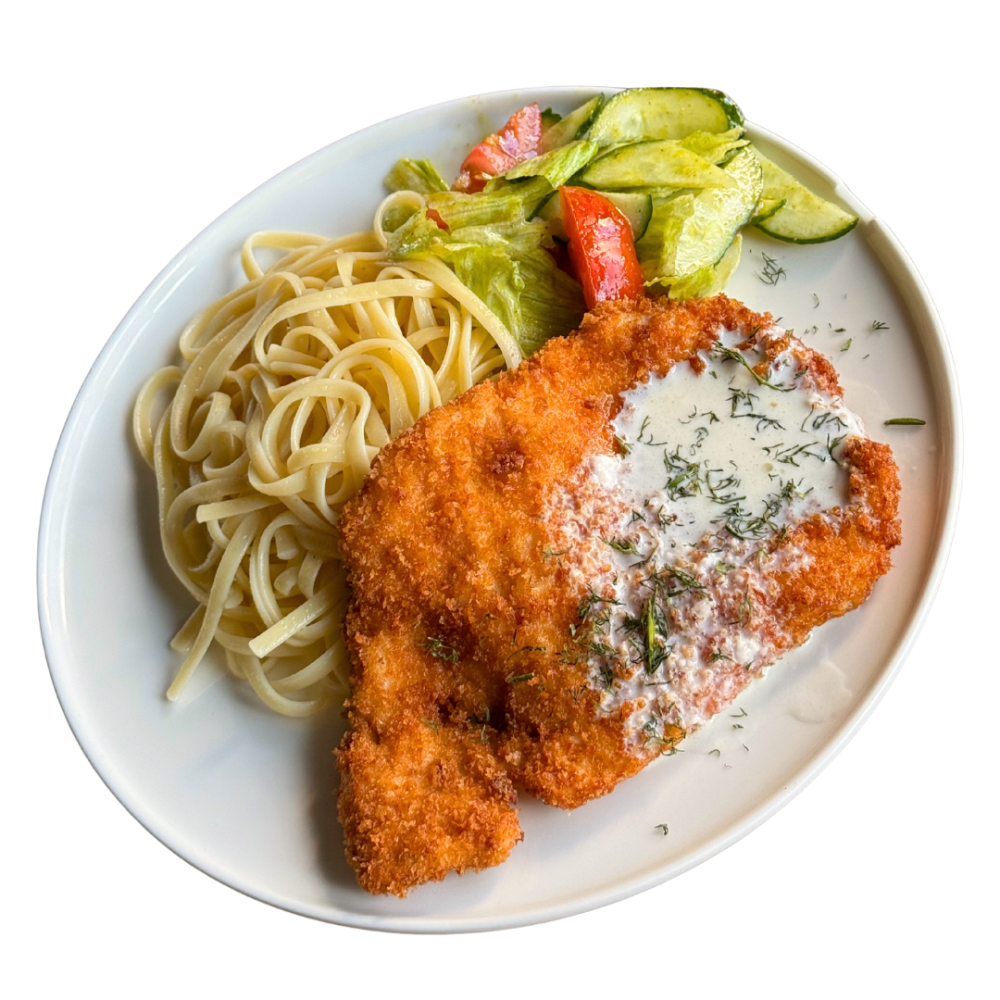 Шницель из куриного филе со спагетти и салатом из овощей