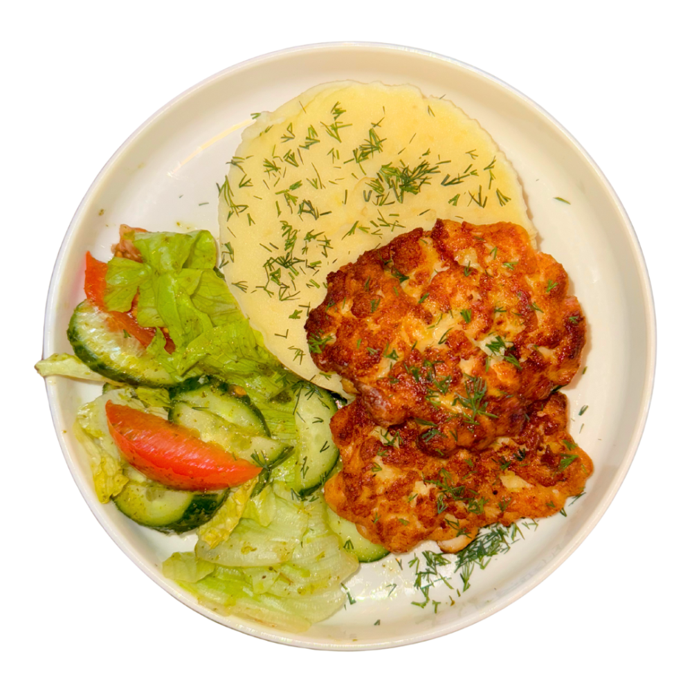 Куриные котлеты с сыром, картофельное пюре, салат из свежих овощей