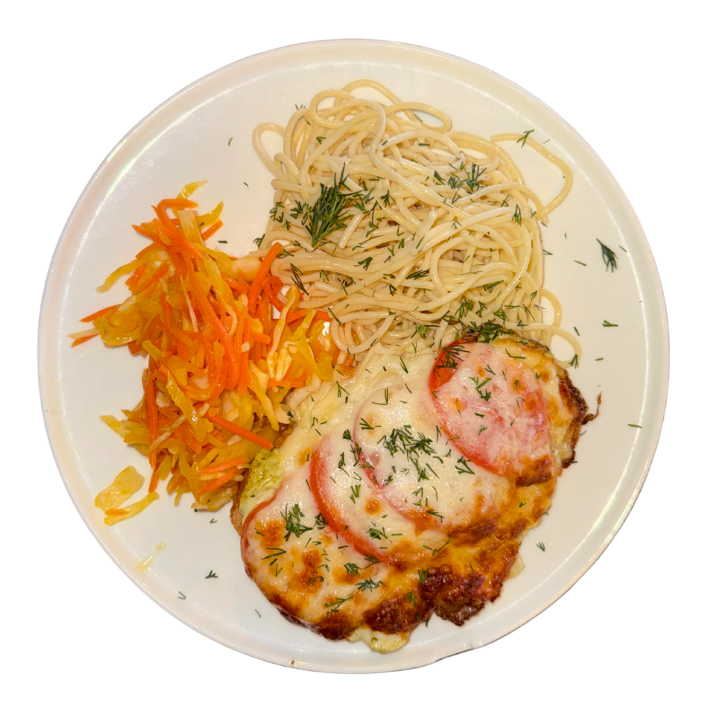 Куриное филе с томатами, спагетти, салат из капусты и моркови