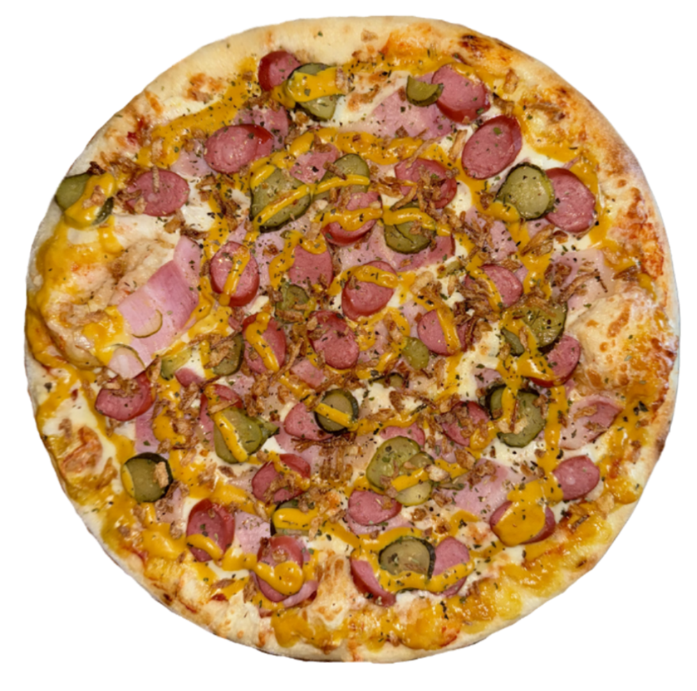 Бекон, моцарелла, охотничьи колбаски, маринованный огурец, жареный лук, горчичный соус