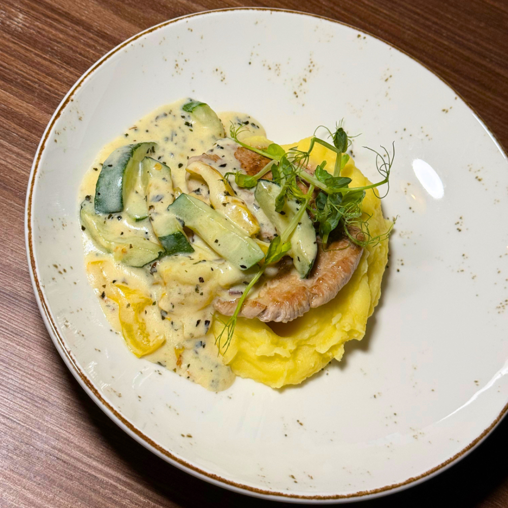 Вырезка из свинины, картофельное пюре, свежий перец, цукини, лук, сливочный соус